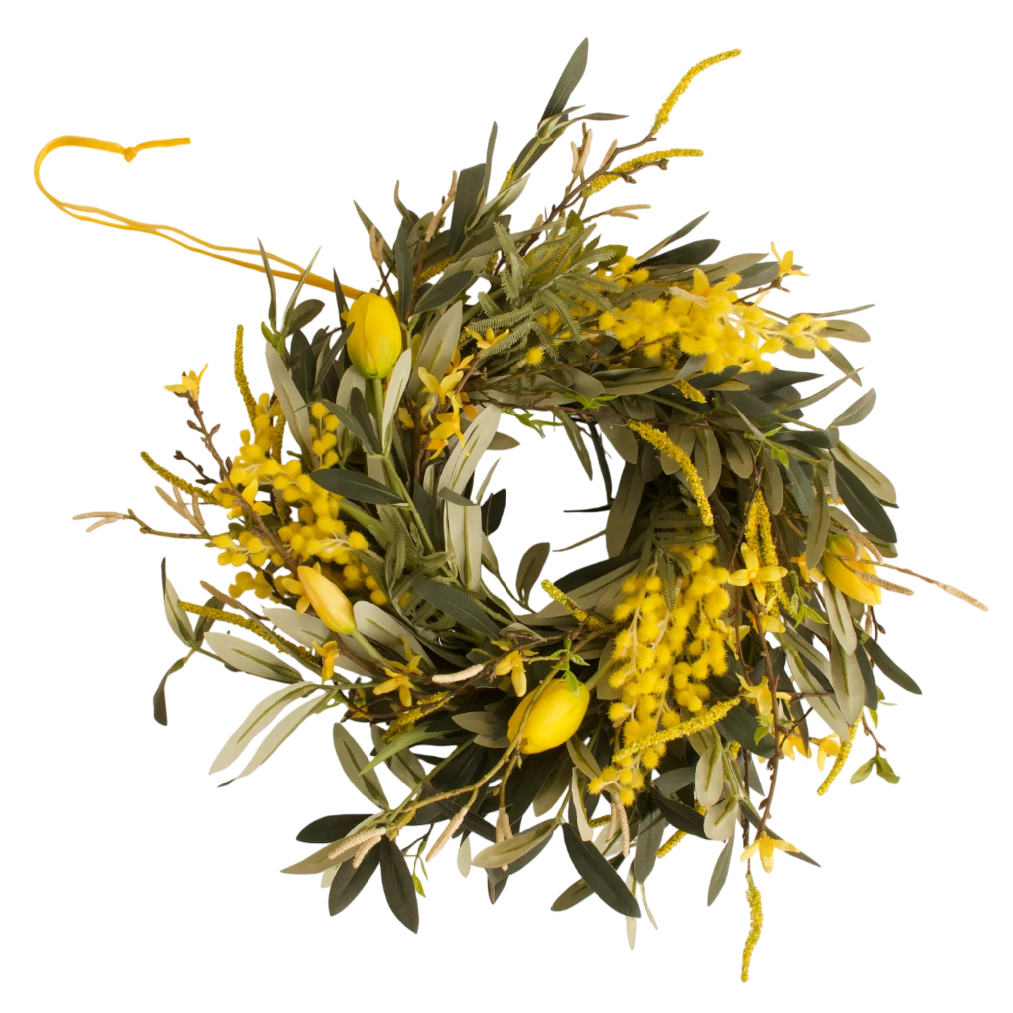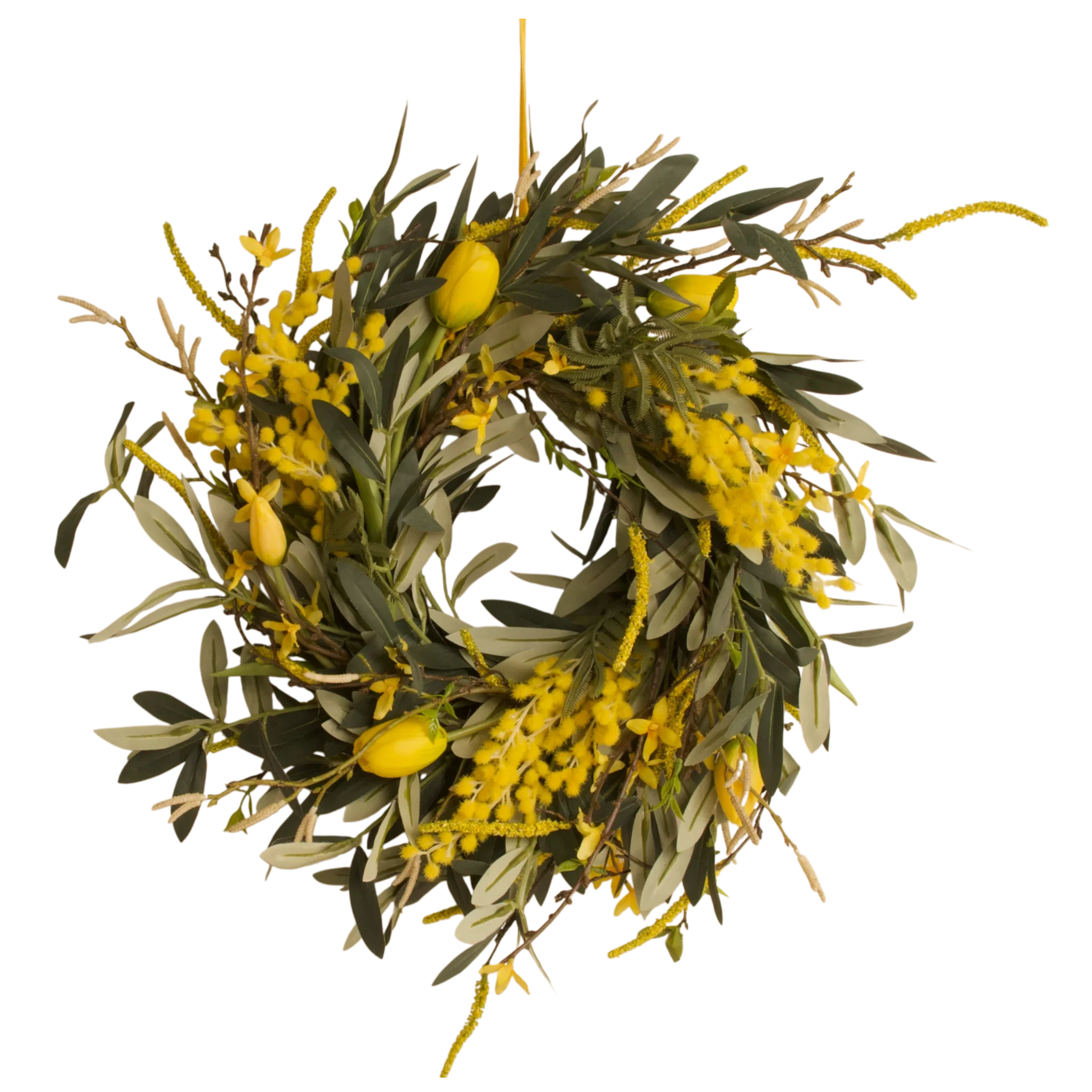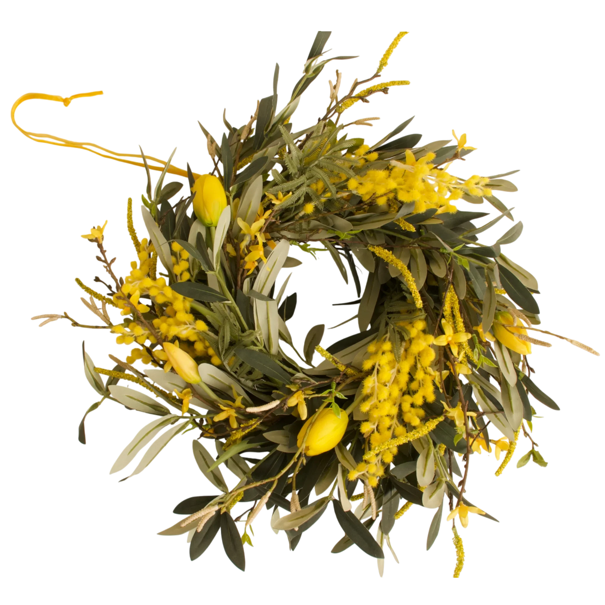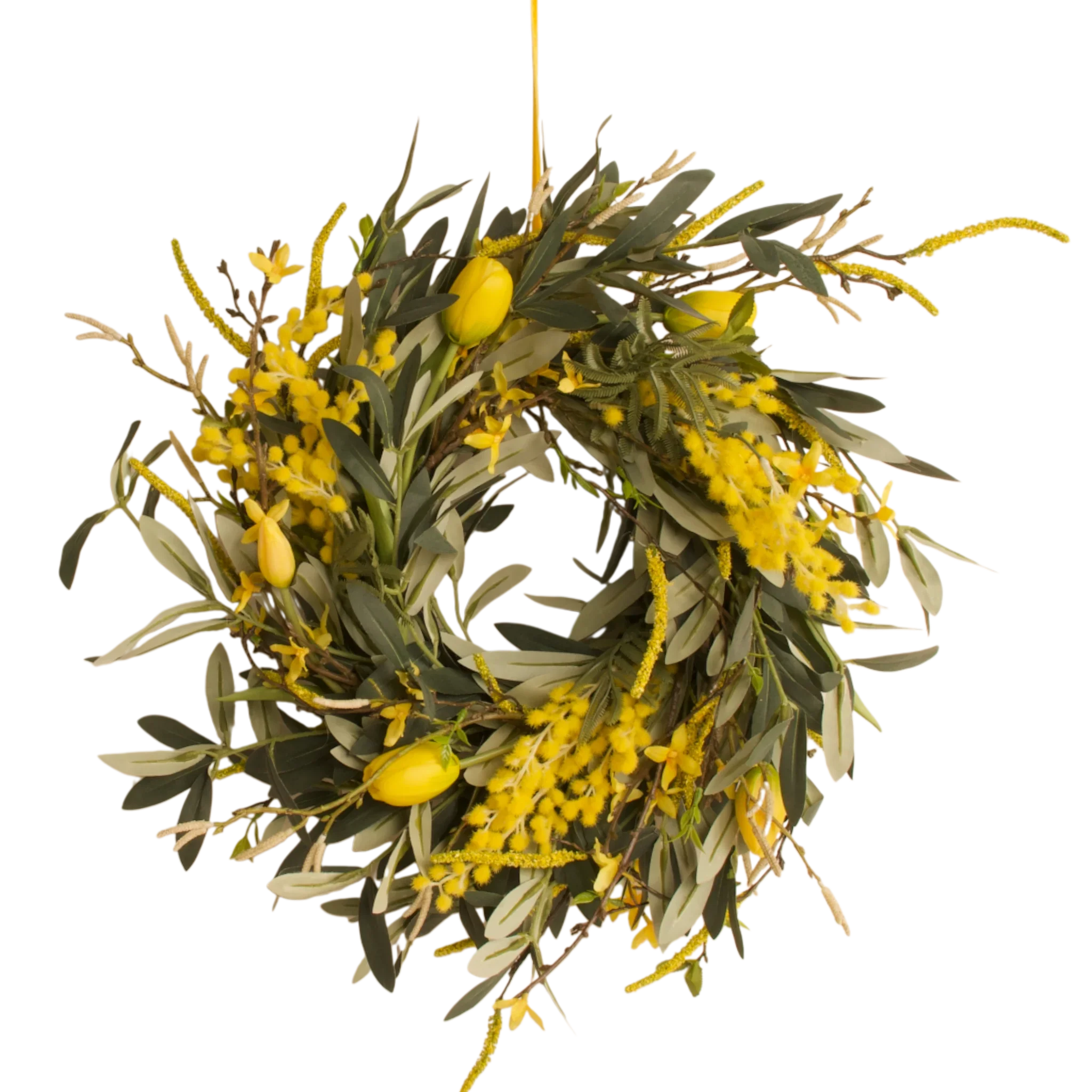 De combinatie van groene tinten en gele accenten zorgt voor een rustgevende, natuurlijke sfeer. Deze krans van kunstbloemen creëert een vriendelijke ambiance die aansluit bij verschillende interieurstijlen. De olijfkrans biedt rust en structuur, terwijl forsythia en mimosa speelse accenten toevoegen. De gele tulpen brengen levendigheid en kleur zonder het geheel druk te maken. De lichte salix en betula geven het decor een zachte, diepe afwerking.