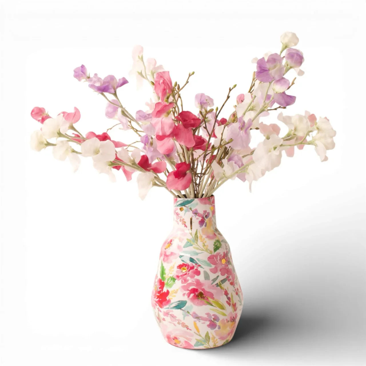 Met een diameter van 18cm en een hoogte van 30cm is deze grote vaas een echte blikvanger in elke ruimte. Hij is multicolor met als hoofdkleur pink en heeft een glanzende print van diverse bloemen. De basis is van metaal en heeft een bolling van 18cm. De bovenkant loop versmald toe in de hals en heeft aan de top een diameter van ongeveer 8cm. In combinatie met de vrolijk gekleurde lathyrus vormt deze vaas een mooi en vrolijke geheel.