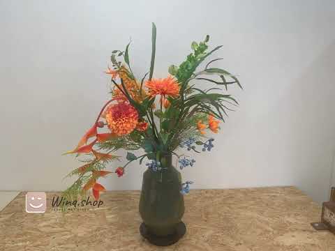 Kunstbloemen Boeket in Oranje is een zorgvuldig samengestelde kunstboeket en combineert warme oranje tinten met een fris blauw accent, ideaal voor een stijlvolle en onderhoudsvrije interieurdecoratie.