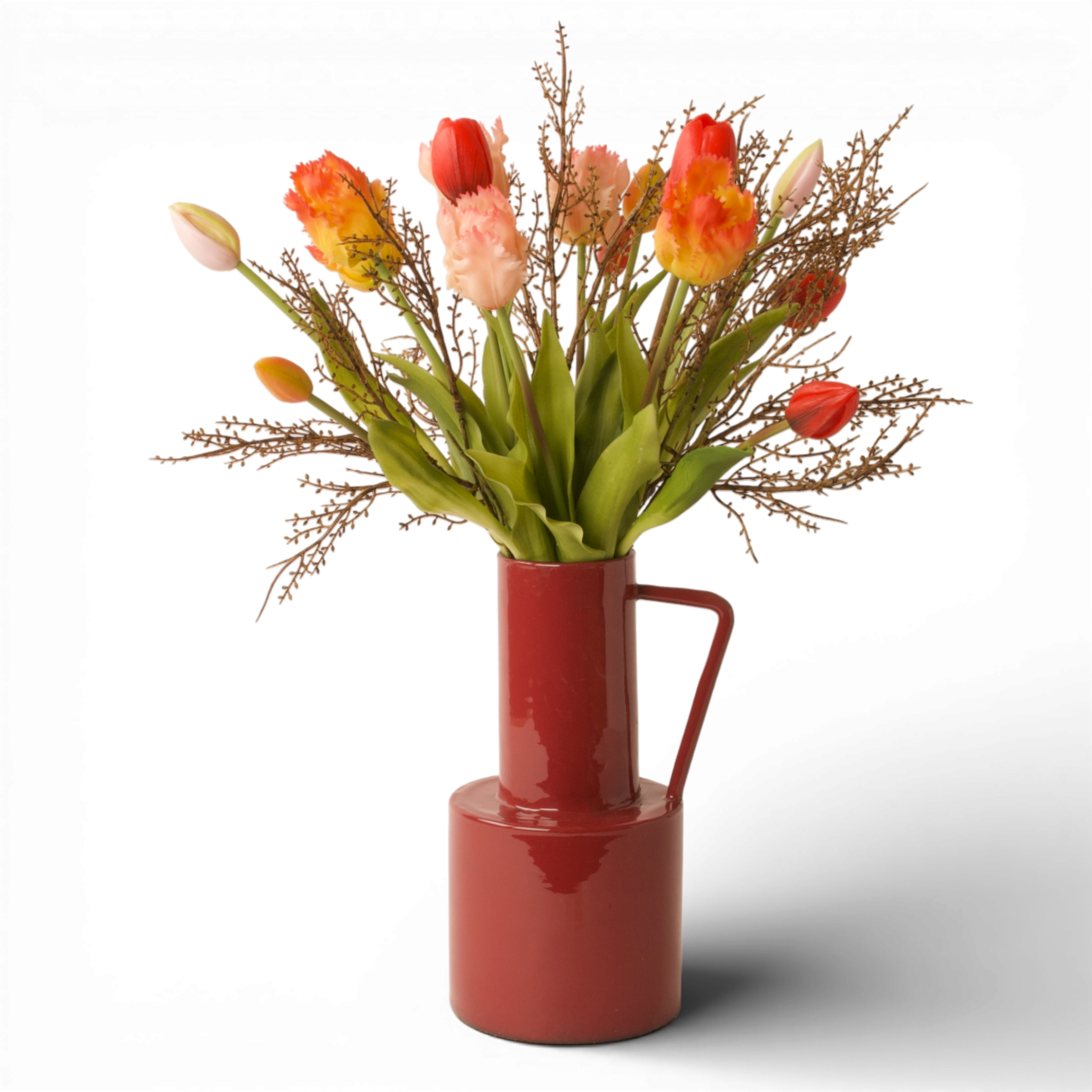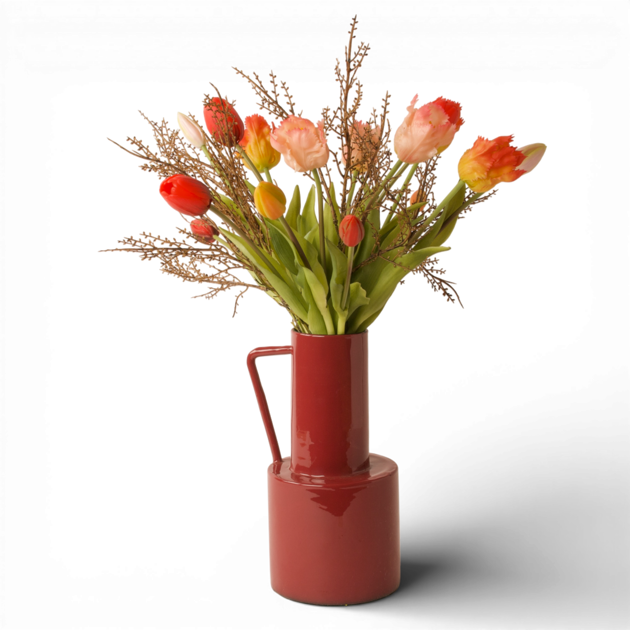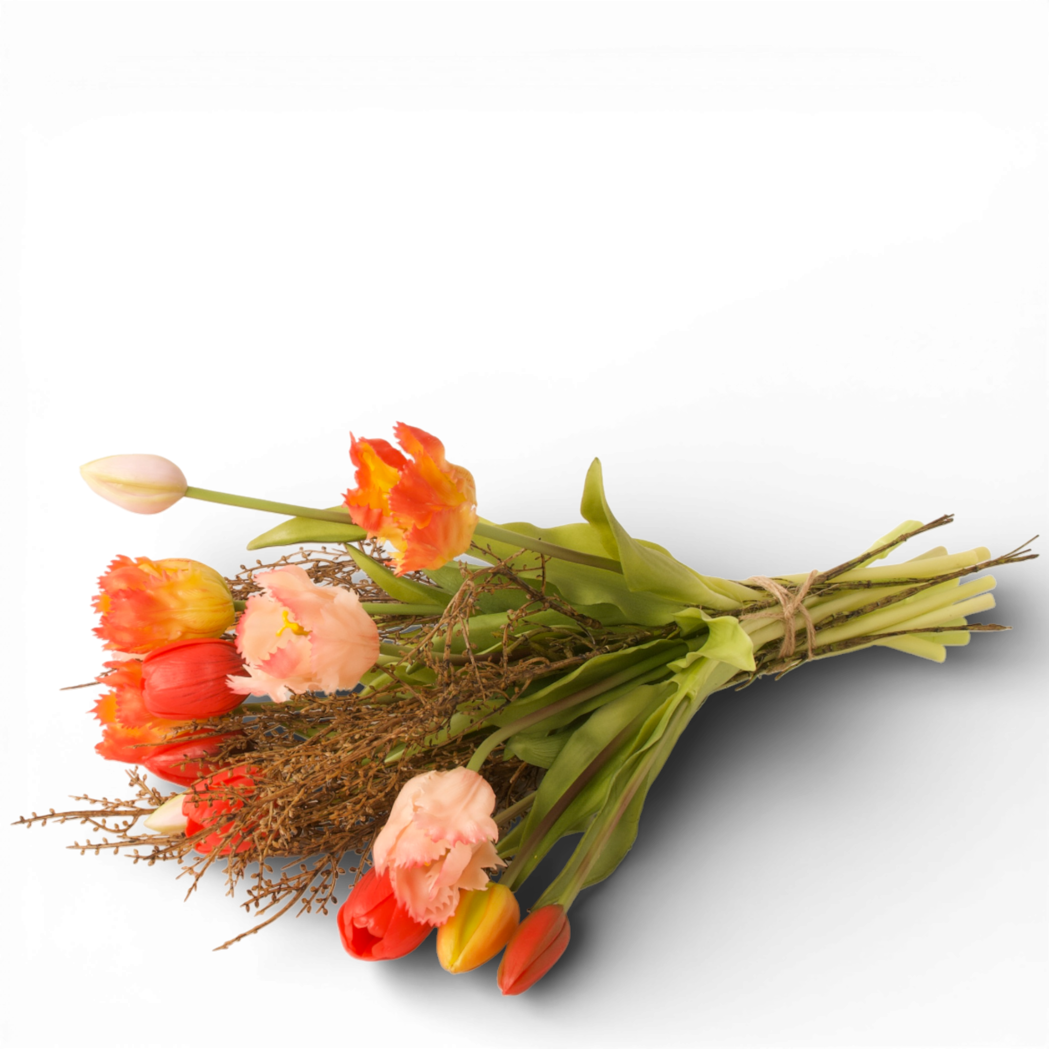 Dit gebonden boeket is samengesteld uit parkiettulpen in zalm en oranje, gecombineerd met een rode tulp en natuurlijke brem takjes in bruin. De mix van uitgesproken bloemvormen en natuurlijke takken zorgt voor een evenwichtig boeket met een warme en toegankelijke uitstraling. Het boeket heeft een hoogte van 40cm en een diameter van 30cm.